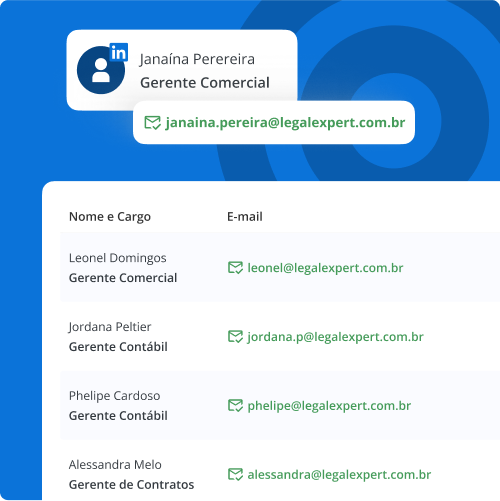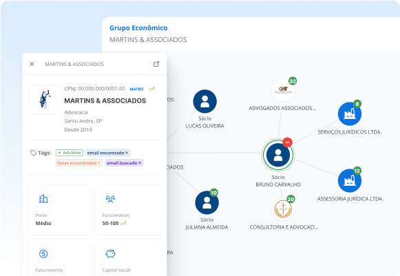 - Nomes e e-mails de sócios e decisores;
